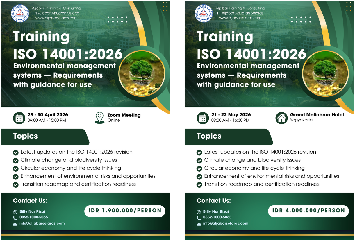 Training ISO 14001:2026 – Environmental Management System (Almost Running: 14-15 Mei 2026 Offline in Yogyakarta) | Investasi: Rp4.000.000,-